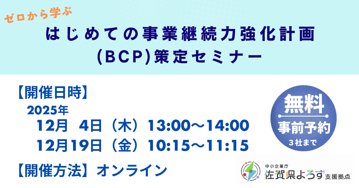 本セミナーでは、このような“ヒト・モノ・カネ・情報”のリスクに備える「事業継続力強化計画(BCP)」を、初めての方にもわかりやすく解説します。