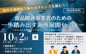 海外市場への進出を検討している方や、販路拡大に課題を感じている方に向けて、「一歩踏み出す海外展開セミナー」を開催します。