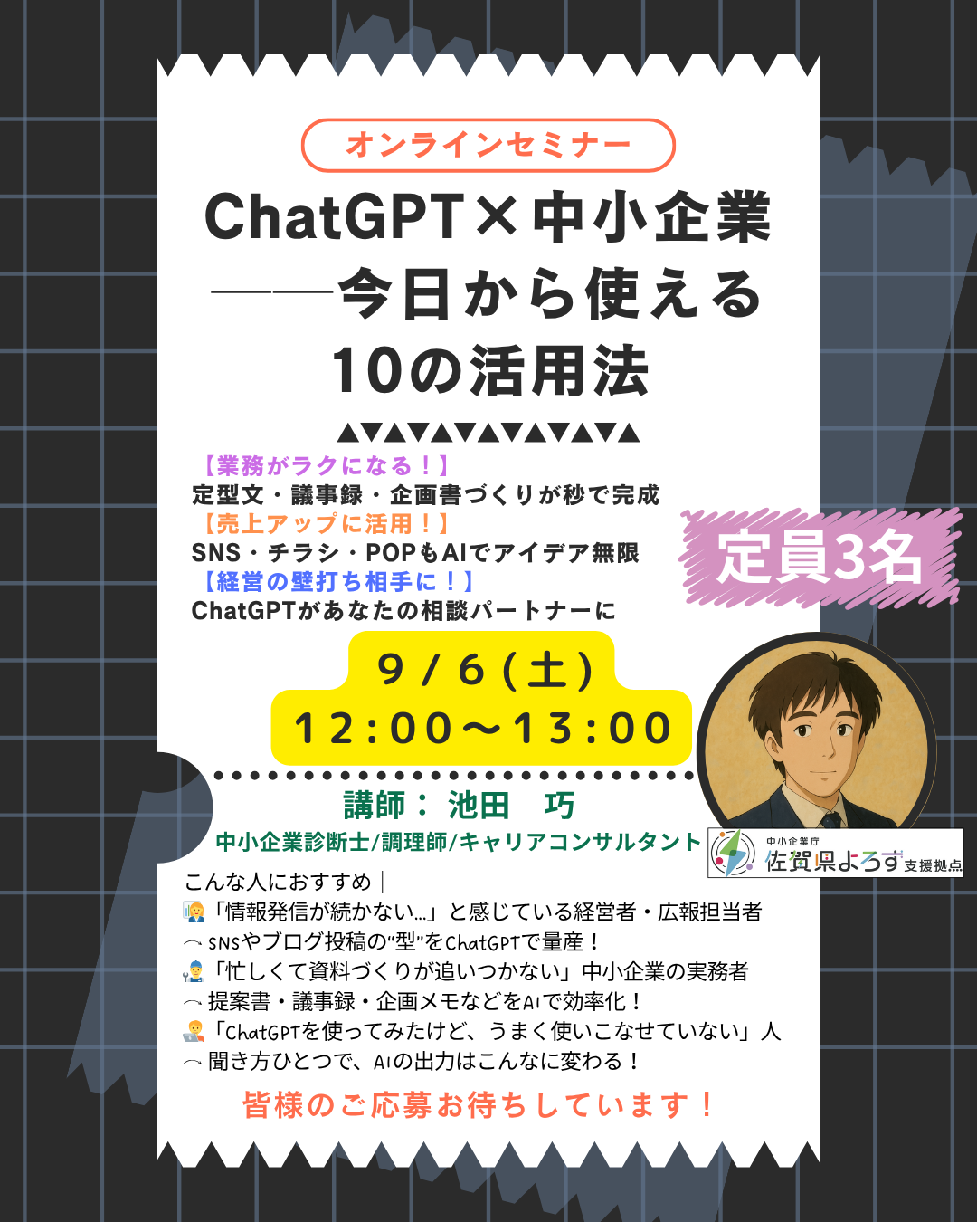 《オンライン》ChatGPT×中小企業──今日から使える10の活用法 2025 8/20 DX(IT活用等) 2025年8月20日 佐賀県 よろず支援拠点 開催日: 2025年9月6日 12:00 - 13:00カテゴリー: DX(IT活用等) 内容 SNS投稿、チラシ、議事録…事務作業をAIで効率化!10の活用例と失敗しないプロンプトを紹介。→ ChatGPTを使いこなせていない方に。 講師紹介 中小企業診断士・調理師・キャリアコンサルタント セミナー参加申込 参加申込はこちら DX(IT活用等) この記事が気に入ったら いいね または フォローしてね! Follow @sagayorozu Follow Me SNSにシェア! URLをコピーしました! URLをコピーしました!