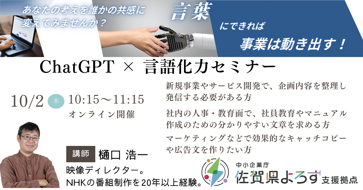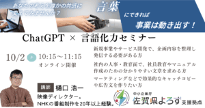 本セミナーでは、ChatGPT無料版を活用し、中小企業の「伝わらない」「まとまらない」課題を解決する言語化する方法を学べます。
