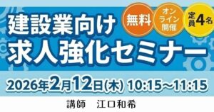 《オンライン》【建設業向け】求人強化セミナー 2026 1/13 人材採用 2026年1月13日 mori 開催日: 2026年2月12日 10:15 - 11:15カテゴリー: 人材採用 セミナー内容 【こんな方におすすめ】 ・自社の魅力を上手く伝えきれない・求人の問い合わせがない・入社してもすぐ辞める・何から始めたら良いかわからない そんな建設業のお悩みを解決する為の方法をご紹介します。 講師紹介 大手ITソリューション会社での営業及びマーケティング業務などを通じて、1,000社以上の企業様へ様々な支援をしてきました。現在は、個人事業主として人材戦略・業務効率化などの業務支援を実施しています。所属組織内外で多くの問題解決を実施してきた経験を活かし、現実的な問題解決の提案を行います。 参加申込はこちら 人材採用 この記事が気に入ったら いいね または フォローしてね! Follow @sagayorozu Follow Me SNSにシェア! URLをコピーしました! URLをコピーしました!