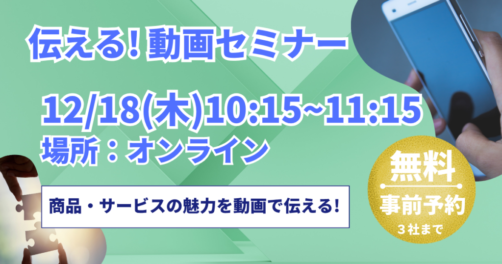 セミナー内容 動画には大きく分けて、「伝える動画」と「集める動画」の2種類があります。企業紹介や採用ムービーなどは「伝える動画」。一方、SNSで多くの人の目に触れ、興味を引き寄せるのが「集める動画」です。本セミナーでは、後者の“伝える動画”に... -