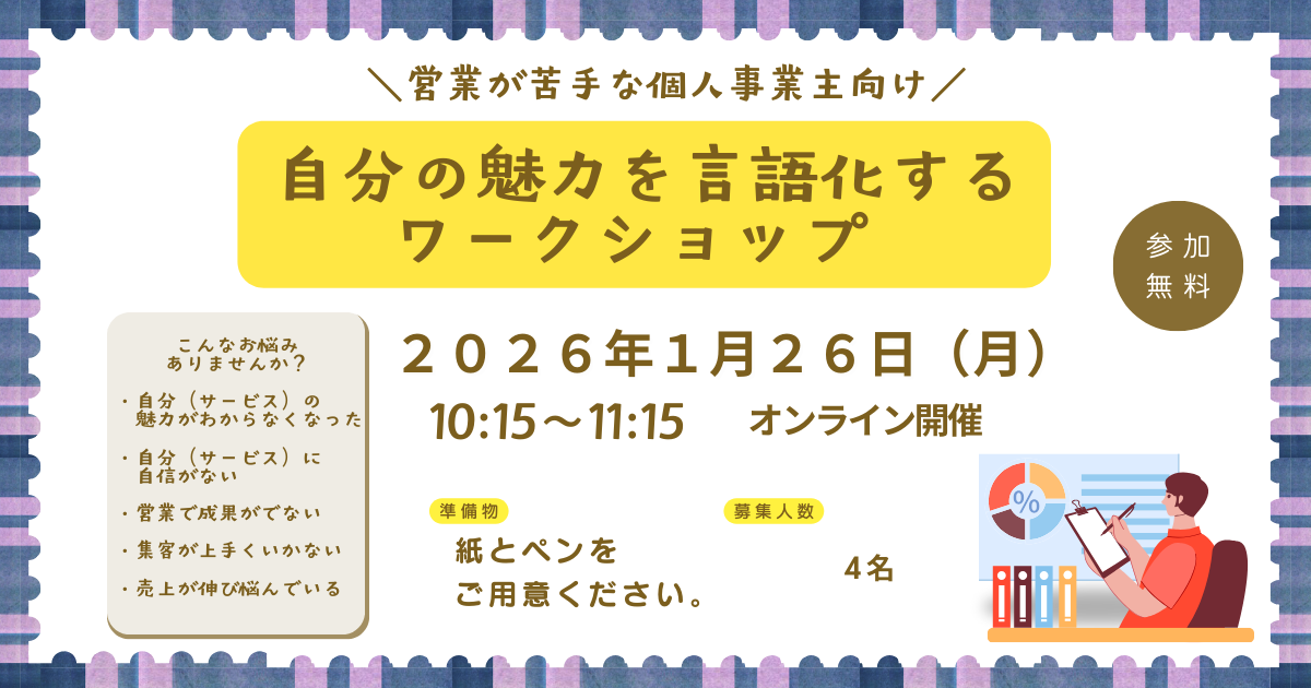 そんな個人事業主のお悩みを解決する第一歩として、自分(サービス)の魅力を言語化するワークショップを開催します。