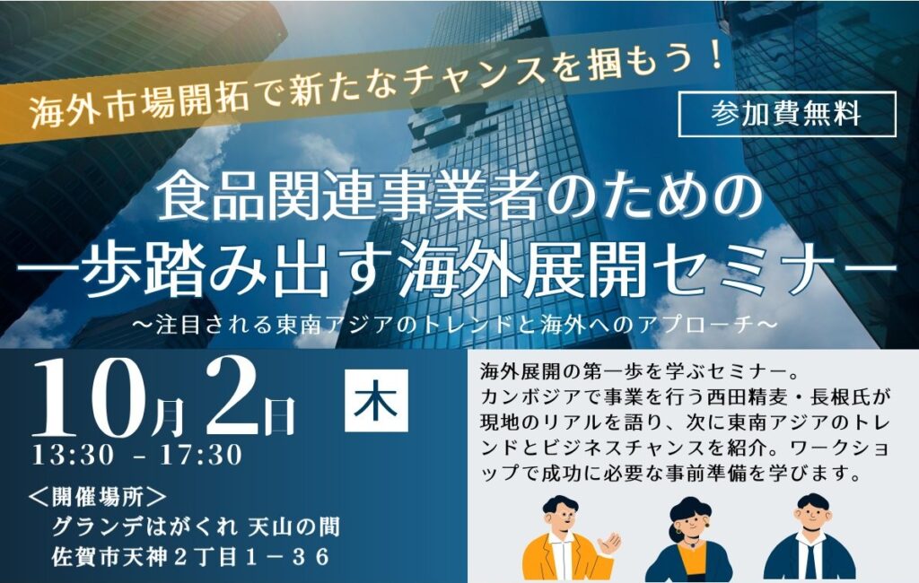 〜注目される東南アジアのトレンドと海外へのアプローチ〜 セミナー概要 佐賀県内外の食品関連事業者の皆さまへ。海外市場への進出を検討している方や、販路拡大に課題を感じている方に向けて、「一歩踏み出す海外展開セミナー」を開催します。 今回のテー... -