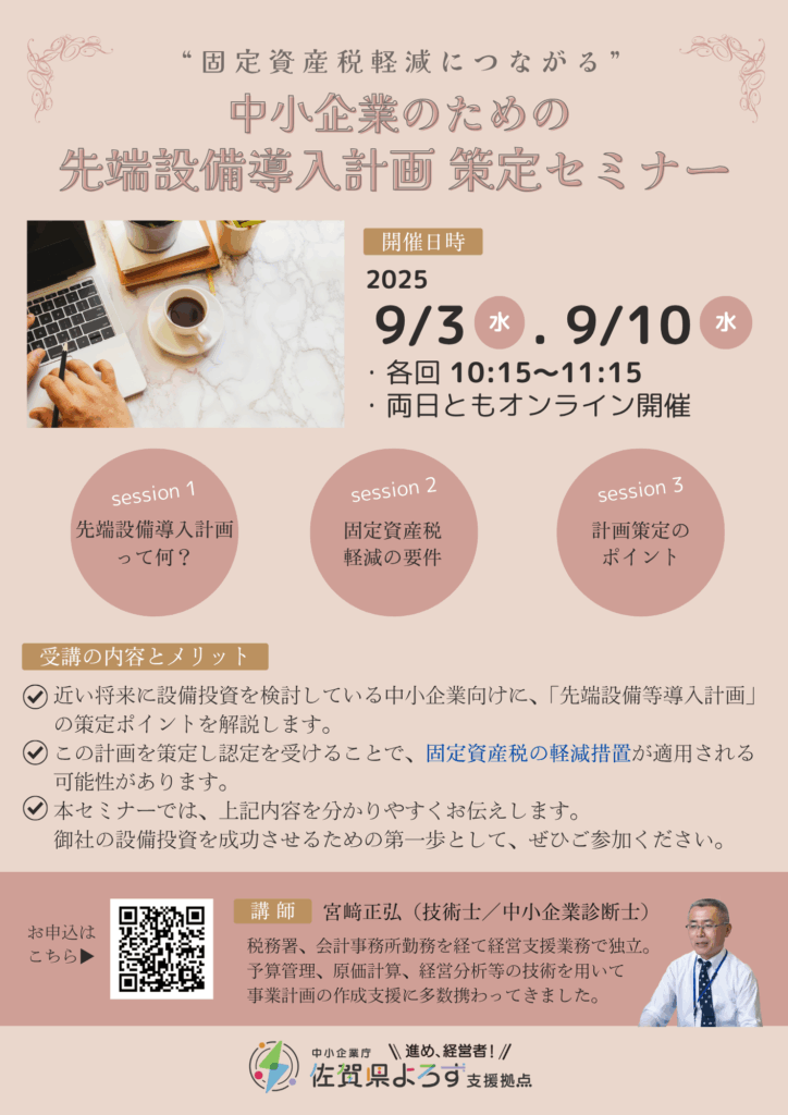 内容 近い将来に設備投資を検討している中小企業向けに、「先端設備等導入計画」の策定ポイントを解説します。この計画を策定し、認定を受けることで、固定資産税の軽減措置が適用される可能性があります。本セミナーでは、以下の内容を分かりやすくお伝え... -
