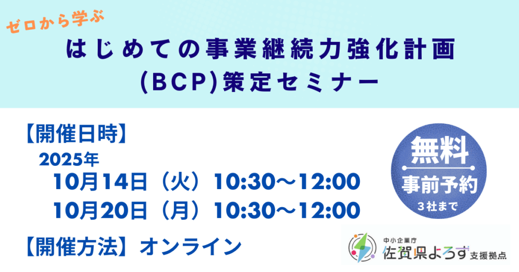 セミナー内容 自然災害や感染症、サイバー攻撃など、企業を取り巻くリスクは年々多様化しています。本セミナーでは、このような“ヒト・モノ・カネ・情報”のリスクに備える「事業継続力強化計画(BCP)」を、初めての方にもわかりやすく解説します。BCPの基... -