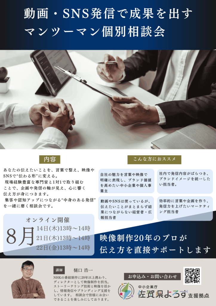 ~映像制作20年のプロが伝え方を直接サポートします~ セミナー内容 あなたの伝えたいことを、言葉で整え、映像やSNSで“伝わる形”に変える。 現場経験豊富な専門家と1対1で取り組むことで、企画や発信の軸が見え、心に響く 伝え方が身につきます。集客や認... -