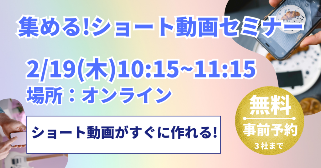 セミナー内容 「会社の魅力を動画で伝えたいけれど、何をどう話せばいいのか分からない…」そんな経営者・広報・採用担当者の方に向けた、“集めるショート動画”の作り方… -